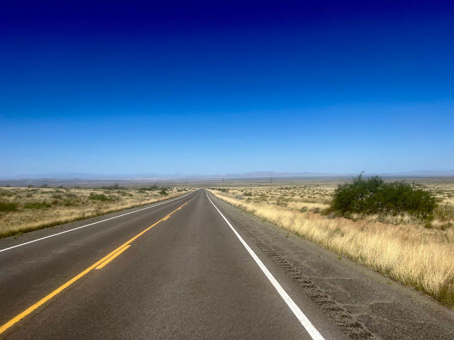 I pedaled back out to the junction with State Highway 90 and then continued northwest on US 70. I was now on the 'Old Country West Trail'. My orientation to the northwest was straight into the wind and the heading was for sixteen miles. I came to the junction of State Highway 464 and kept going straight. I came to the junction of Cap Rock Ranch Road and was sixteen miles from the Arizona border. It was 12:30 PM and my right eye was burning, which was where my bandanna came in handy. A wide smooth shoulder opened up, and I took advantage of it. I occasionally got caught in the jaw rattling rumble strip.
